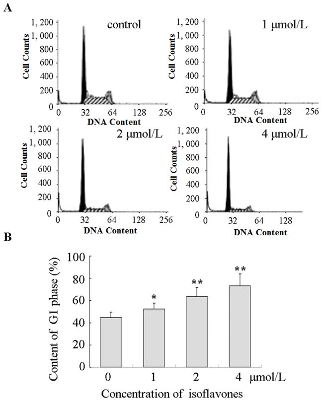 Flow cytometry was used to distinguish between cells in different phases of the cell cycle. G1 phase arrest was seen in cells treated with isoflavones, as shown in Figure 2A. The proportions of cells in the G1 phase after treatment with 0, 1, 2 and 4 μmol/l isoflavones were 44.53 ± 5.03%, 52.37 ± 5.24%, 63.73 ± 8.01% and 73.24 ± 10.98%, respectively (Figure 2B). Flow cytometry analysis showed that isoflavone treatment induced G1 arrest in a time-dependent manner which was associated with a concomitant significant.