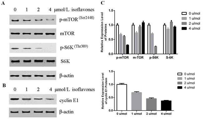 Cyclin E1 is a positive regulator that controls the transition of cells from G1 to S phase [28]. Numerous data have demonstrated that inhibiting mTOR decreases S6K phosphorylation, with a concomitant decrease in cyclin E1 levels [22, 29]. We therefore explored the effects of isoflavones on cyclin E1. As shown in Figure 3B, cyclin E1 decreased in cells treated with isoflavones. These results showed that isoflavones suppressed mTOR-mediated accumulation of cyclin E1.