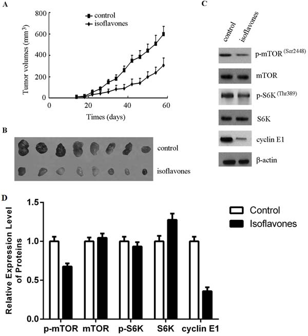 mTOR activity was assessed in the xenografted tumour tissue. As shown in Figure 4C and 4D, p-mTOR, p-S6K and cyclin-E1 expression was lower in the isoflavone-treated group than in the control group. These results showed that isoflavones also affected mTOR-mediated accumulation of cyclin E1 in vivo.