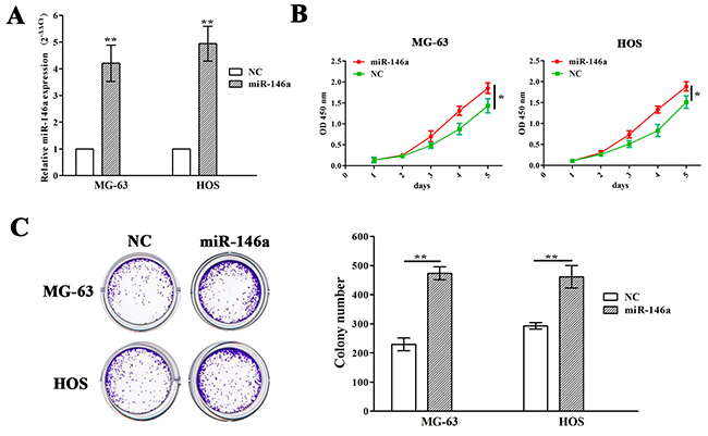 Figure 3: Ectopic expression of miR-146a promoted OS cell proliferation and colony formation. (A) qRT-PCR analysis of the transfection efficiency of lentivirus mediated miR-146a in MG-63 and HOS cells. (B) The effects of miR-146a overexpression on cell proliferation of MG-63 and HOS cells indicated by MTT assay. (C) The effects of miR-146a overexpression on cell colony formation of MG-63 and HOS cells. * P<0.05, **P<0.01.