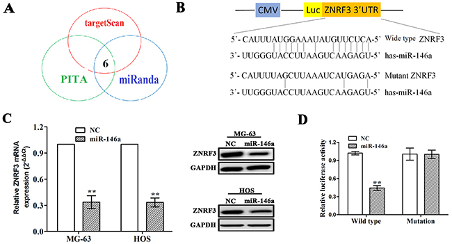 Figure 4: ZNRF3 gene was identified as a direct target of miR-146a. (A) 6 target genes of miR-146a were identified by miRNA forecasting software. (B) Diagrams demonstrated the miR-146a putative binding sites and corresponding mutant sites of ZNRF3. (C) The expression levels of ZNRF3 were examined after transfection with miR-146a by qRT-PCR and Western blotting assays in MG-63 and HOS cells. (D) Luciferase activity of ZNRF3 (wild type or mutation) was evaluated after miR-146a transfection into MG-63 and HOS cells. **P<0.01.