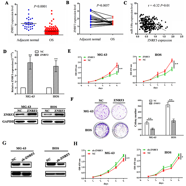 Figure 5: Enforced expression of ZNRF3 inhibited OS cell proliferation and colony formation. (A) The expression of ZNRF3 in OS tissues (n=237) and the adjacent normal tissues (n=25) shown by TCGA data. (B) The expression of ZNRF3 in paired OS tissues (n=25). (C) Thecorrelation analysis showed the association of miR-146a expression with ZNRF3 in OS patients. (D) The transfection efficiency of ZNRF3 overexpression was determined by qPCR and western blot assays in MG-63 and HOS cells. (E) The effects of ZNRF3 overexpression on cell proliferation of MG-63 and HOS cells by MTT assay. (F) The effects of ZNRF3 overexpression on cell colony formation of MG-63 and HOS cells. (G) Western blot analysis of the transfection efficiency of ZNRF3 knockdown in MG-63 and HOS cells transfected with sh-ZNRF3 and NC. (H) The effects of ZNRF3 knockdown on cell proliferation of MG-63 and HOS cells by MTT assay. * P<0.05, **P<0.01.