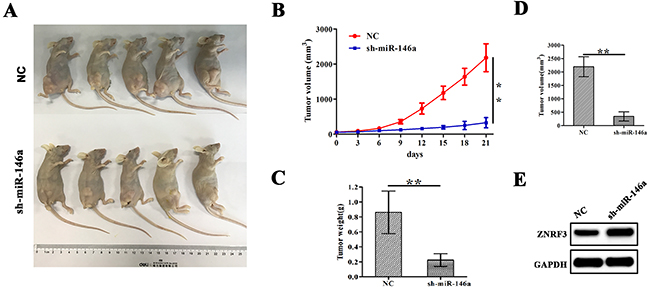 Figure 7: Knockdown of miR-146a inhibited U-2OS xenograft tumor growth. (A) Schematic representation of the subcutaneous xenograft tumor size between sh-miR-146a and NC groups. (B) The effects of miR-146a knockdown on tumor proliferation activity of U-2OS xenograft tumors. (C, D) The effects of miR-146a knockdown on the average weight and volumes in xenograft tumors on the 21st day. (E) Western blotting analysis of the effect of miR-146a knockdown on ZNRF3 expression. **P<0.01.