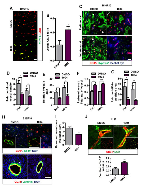 Staining of LLC tumor sections for pericyte marker NG2 and desmin revealed pericyte coverage deficiency, as previously noted [27]. However, Sac-1004-treated tumors exhibited marked increase in extent and fraction of NG2 and desmin-positive pericyte covered vessels (Figure 2J and Supplementary Figure S5F,G). Unlike LLC tumors, B16F10 tumor blood vessels are covered with pericytes as noted previously [28] and Sac-1004 treatment did not induce any further change (Supplementary Figure S5H).