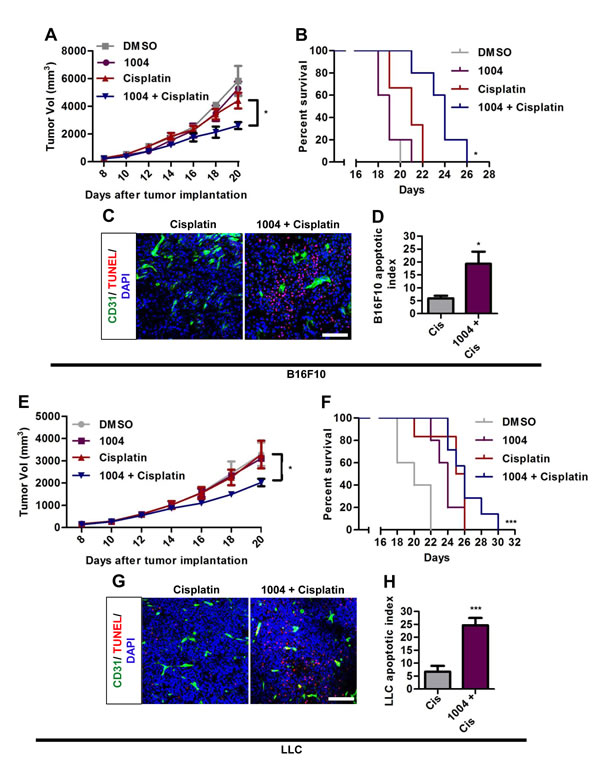 Reducing vascular leakage increases the efficacy of drug delivery to tumor [1]. Combination therapy of B16F10 tumor-bearing mice with Sac-1004 and cisplatin showed that tumor growth was not much affected by cisplatin alone; however, the growth inhibition was significantly augmented in combination group (Figure 3A). Consequently, survival of tumor-bearing mice was substantially increased in the combination group (Figure 3B). Similar patterns were found in LLC tumors treated with Sac-1004 and cisplatin (Figure 3E,F). Consistently, TUNEL-positive apoptotic cells were markedly increased in B16F10 and LLC tumors of combination treatment group (Figure 3C,D,G,H). These results suggest that Sac-1004 could enhance the access of cytotoxic drugs to tumor cells and thereby improve therapeutic response.