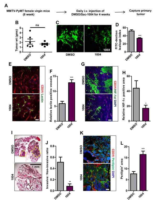 Figure 4: Sac-1004 reduces vascular leakage, HIF-1α expression and malignancy of breast tumor in MMTV-PyMT mice model. (A) Schematic plan for the treatment of MMTV-PyMT female mice with Sac-1004. (B) Comparison of breast tumor weight of MMTV mice (n = 7) after treatment with Sac-1004. ns, not significant. (C) MMTV mice were injected with FITC-dextran before capture of tumor (n = 7). (D) FITC-dextran leakage from blood vessels as shown in (C) was quantified using ImageJ software. (E) Immunostaining of MMTV tumor sections (n = 7) for CD31 and lectin. (F) Quantitation of lectin positive vessels as shown in (E) using ImageJ software. (G) MMTV tumor sections were stained for CD31 and HIF-1α (n = 7 mice). (H) Quantitation of HIF-1α positive tumor area as shown in (G) using ImageJ software. (I) Hematoxylin and eosin staining of MMTV breast tumor sections (n = 7). Yellow circle denotes invasive zone. Scale bar, 1 mm. (J) Quantitation of ratio of invasive and non-invasive regions from figure shown in (I) using Multi Gauge software. (K) Immunohistochemical staining of MMTV tumor sections with CD31 and perilipin (n = 7 mice). (L) Quantitation of perilipin positive area from Figure shown in (K) using ImageJ software. Scale bar, 100 µm (in all images). *P<0.05; **P<0.01; ***P<0.001 (Student’s t-test). Data are represented as mean ± s.e.m.