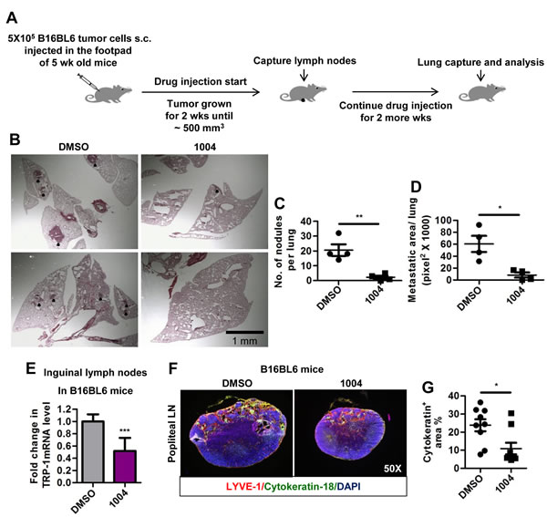 Another widely used model for spontaneous lung and lymph node metastasis involves injecting B16BL6 cells into the right footpad of mice, from where they metastasize to lymph nodes and lungs [31]. In consistence with MMTV tumor metastasis, B16BL6 tumor-bearing mice receiving Sac-1004 (Figure 6A), exhibited reduced number and size of lung metastatic colonies (Figure 6B-D). In addition, there was a sharp drop in cytokeratin-18 positive cells migrating to popliteal lymph nodes (Figure 6F,G). Real-time-PCR analysis of inguinal lymph nodes for tyrosinase-related-protein-1 (melanocyte marker) also confirmed decreased lymph node metastasis in Sac-1004 treated mice (Figure 6E); however, lymphatic vessel number or structure seemed unaffected (Supplementary Figure S6J). Hence, Sac-1004 was able to reduce distant and regional metastasis in B16BL6 mice model.