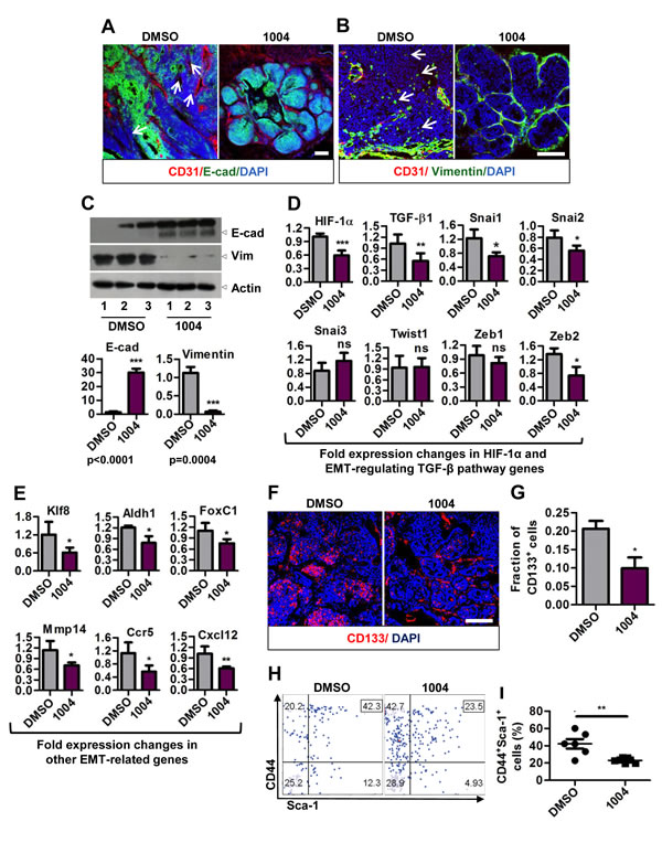 Figure 7: Sac-1004 hinders epithelial-to-mesenchymal transition by affecting related genes and also reduces cancer stem cell population. (A) Immunostaining of control or drug-treated MMTV tumor sections (n = 7) for CD31 and E-cadherin. Arrows indicate the patches unstained with E-cadherin. (B) MMTV tumor sections (n = 7) were stained with CD31 and vimentin. Arrows indicate vimentin positive cells in the tumor mass. (C) Western blot of protein samples isolated from control and drug-treated MMTV tumors for E-cadherin and Vimentin (three individual experiments). Quantitation of the blots is shown below. (D and E) Real-time PCR analysis of RNA samples isolated from MMTV tumor (long-term treatment) to show the fold difference in expression of TGF-β pathway (D), and other (E) genes. All gene expressions were normalized to cyclophilin B. (F) Immunostaining of MMTV tumor sections (n = 7) for CD133+ cancer stem cells. (G) Quantitation of CD133+ cell fractions from the sections stained in (F) using ImageJ software. (H) FACS analysis of tumor cells isolated from MMTV tumors (n = 7; long-term treatment) for CD44+Sca-1+ cell fraction. (I) Quantitation of CD44+Sca-1+ cell fraction as shown in (H). Scale bar, 100 µm (in all images). *P<0.05; **P<0.01; ***P<0.001 (Student’s t-test). Data are represented as mean ± s.e.m.