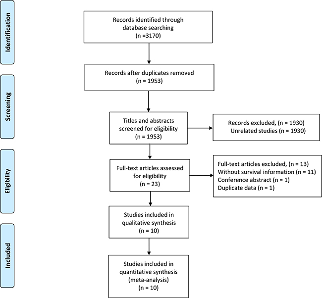 Our search strategy yielded 3,170 potentially relevant articles. After excluding duplicate articles, 1,953 potentially eligible studies were selected. 1,930 studies were excluded after screening titles and abstracts. 23 relevant studies were selected for further evaluation; 13 studies were excluded after reviewing the full article. Thus, 10 studies, comprising a total of 874 patients, were included in the quantitative synthesis [19, 21, 23, 24, 31–36]. The selection process is shown in Figure 1.