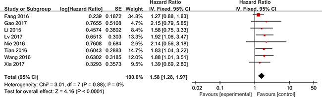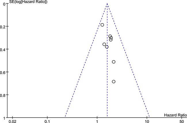 All studies were published in 2015 or later, and conducted in China. The number of patients in each study varied from 54 to 173. Various cancers were recorded in our study, including hepatocellular carcinoma (HCC), gastric cancer (GC), colorectal cancer (CRC), non-small cell lung cancer (NSCLC), ovarian cancer (OC), colonic cancer (CC), and glioma. There were eight studies for OS, three for RFS, seven for lymph node metastasis (LNM), three for vascular invasion, and nine for cancer stage enrolled in the database-based analysis. HRs and 95% CIs in three studies were extracted directly. HR values in five studies were estimated by Kaplan-Meier survival curves. In methodological quality of studies, the overall NOS scores ranged from 6 to 8. Detailed patient characteristics are shown in Table 1.