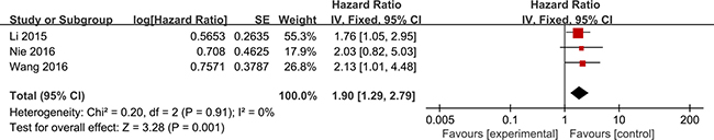 Eight studies reported data on ZFAS1 expression and OS. The results showed that elevated ZFAS1 expression was associated with a poor OS (HR, 1.58; 95% CI, 1.28–1.97; P < 0.001; Figure 2). There was no significant heterogeneity among studies (I2 = 0%; P = 0.88); thus, the fixed-effects model was used. A meta-analysis of HRs for RFS was performed on three studies, and the negative prognostic effect of a high ZFAS1 expression on RFS was again observed (HR, 1.90; 95% CI, 1.29–2.79; P = 0.001; Figure 3) using the fixed-effects model (heterogeneity test: I2 = 0%; P = 0.91).