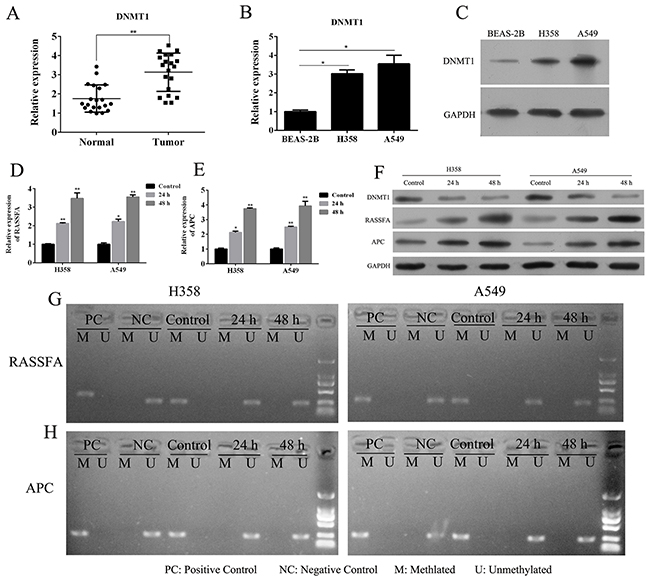 The lung cancer cell line A549 and H358, and the normal lung epithelial cell BEAS-2B were purchased from the cell bank of the Chinese academy of sciences (Shanghai, China) and cultured in Dulbecco’s Modified Eagle’s medium (DMEM) supplemented with 10% FBS (Life Technologies, USA), ampicillin and streptomycin at 37 °C, 5% CO2 conditions. lung cancer tissues (n=20) and corresponding paracancerous tissues (n=20) were collected from department of Thoracic Surgery, the Affiliated Hospital of Guilin Medical University. All of the patients diagnosed with primary lung cancer were confirmed by hematoxylin and eosin staining by experienced pathologists. 5-Aza-CR was purchased from 5-Aza-CR (Sigma, St. Louis, MO). siRNA of DNMT1 (5’-GCCUCAUCGAGAAGAAUAUUU-3’) or control (5’-CAGAUGUUGCCAACAACAAGA-3’) was purchased from RiboBio (Guangzhou, china). Anti DNMT1, RASSF1A, APC and GAPDH antibodies were obtained from Cell Signaling Tech (Denver, MA).