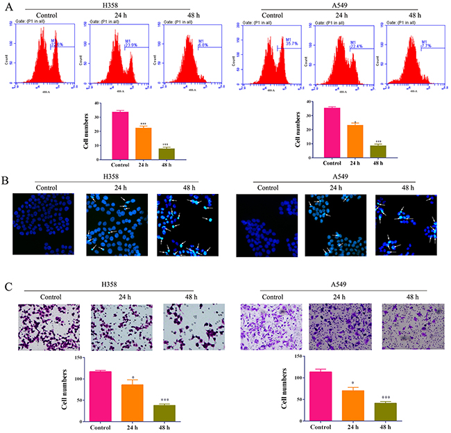 Figure 2: The proliferation (A), apoptosis (B) and migration (C) of lung cancer cell lines A549 and H358 cells treated with 5-Aza-CR were determined by BrdU assay, hochestassay and transwell assay, respectively.