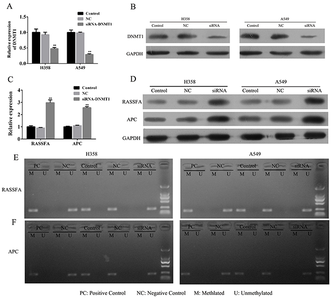 Figure 3: The lung cancer cells A549 and H358 were transfected with siRNA-DNMT1 or negative control and the mRNA (A) and protein expression (B) of DNMT1 and RASSF1A and APC (C-D) were assessed by Q-PCR and WB. The status of methylationof RASSF1A and APC were determined by MSP (E-F). **P< 0.01, data represent the means ± s.d.