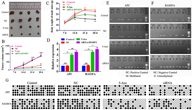Figure 5: Nude mice (6 per group) were inoculated subcutaneously with 3×106 A549 cells and treated i.p. 500 nM /dose 5-Aza-CR or 10 nM siRNA-DNMT1 or negative control. The tumor volume (mm3) (A-B) and body weight (C) were measured. After sacrifice, the tumor tissues were collected to analyze the expression (D) and the status of methylation of RASSF1A and APC (E-G). *P< 0.05, **P< 0.01, ***P< 0.001. Data represent the means ± s.d.
