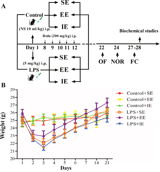 Figure 1: Timeline of the experimental procedure in mice (A). Effects of LPS and environmental conditions on body weight gain (B). SE, standard environment; EE, enriched environment; IE, impoverished environment; OF, open field; NOR, novel object recognition; FC, fear conditioning. NS, normal saline; LPS, lipopolysaccharide.
