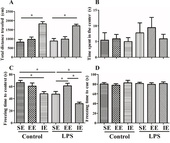 Figure 2: Effects of LPS and environmental conditions on anxiety-like behavior and fear conditioning response. Open field test was performed to examine the anxiety-like behavior and locomotion (A and B). LPS-exposed mice displayed an environment-dependent impairment in cognitive function (C and D). SE, standard environment; EE, enriched environment; IE, impoverished environment. Each value represents the mean ± SEM (n =11-14 per group), *P < 0.05.