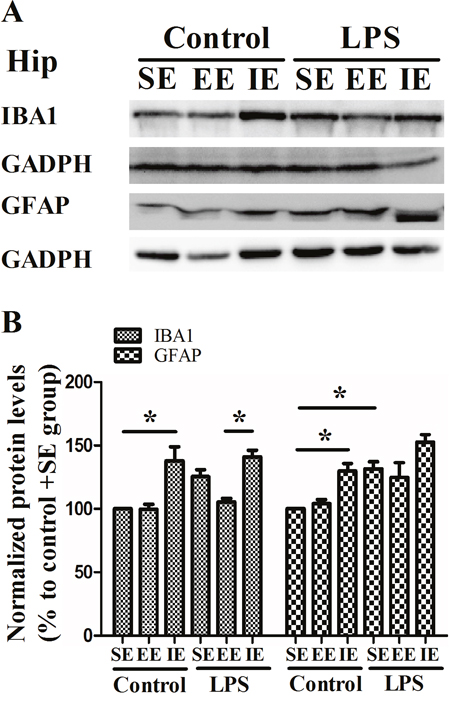Figure 5: Effects of LPS and environmental conditions on hippocampal IBA1 and GFAP expressions. Representative images of IBA1 and GFAP in the hippocampus (A). Quantification of IBA1 and GFAP expressions in the hippocampus (B). SE, standard environment; EE, enriched environment; IE, impoverished environment. Each value represents the mean ± SEM (n =4 per group), *P < 0.05.