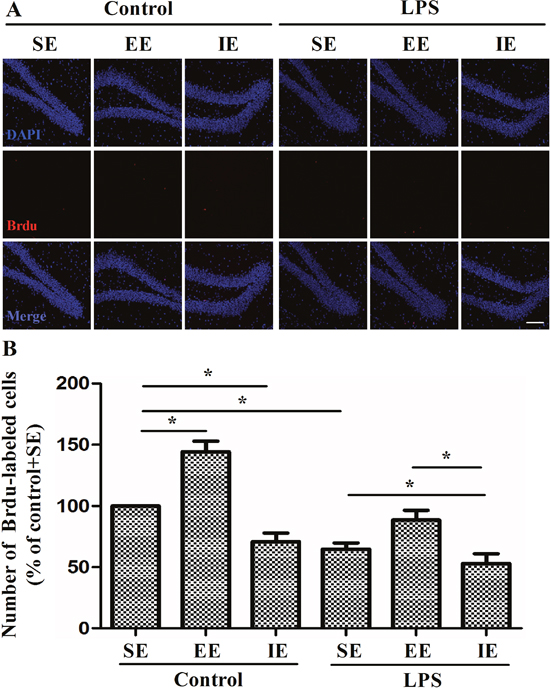 Figure 6: Effects of LPS and environmental conditions on hippocampal neuronal proliferation. Representative images of BrdU cells at the DG region by immunofluorescence (A). Quantification of BrdU at the DG region of hippocampus (B). SE, standard environment; EE, enriched environment; IE, impoverished environment. Each value represents the mean ± SEM (n = 6 per group), *P < 0.05; scale bar = 50 μm.