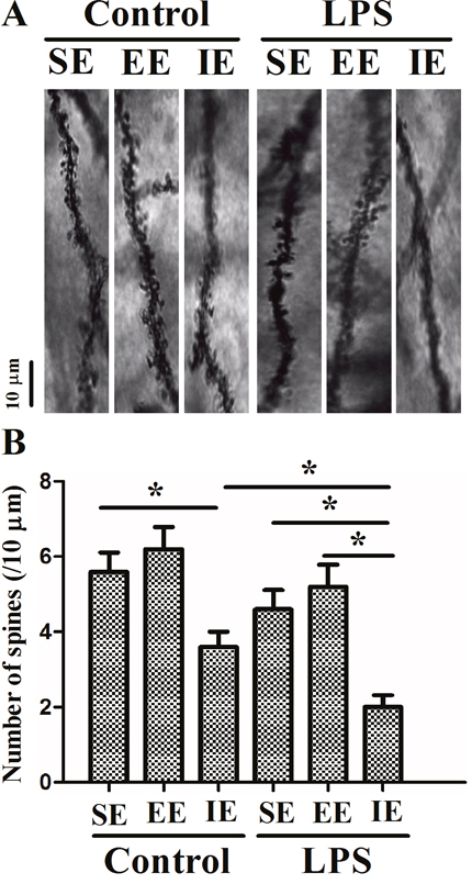 Figure 7: Effects of LPS and environmental conditions on dendritic spine in the hippocampal CA1. Representative images of dendritic segments of pyramidal neurons in the hippocampus (A). Histograms represented the number of dendritic spines/10 μm length of primary dendrites (B). SE, standard environment; EE, enriched environment; IE, impoverished environment. Each value represents the mean ± SEM (n =5 per group), *P < 0.05.