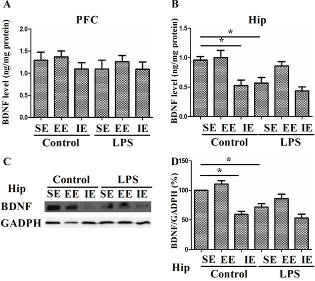 As shown in Figure 8, the level of BDNF decreased significantly in the control + IE group compared with those in the control + SE group, suggesting IE impaired cognitive impairment by decreasing BDNF level in the hippocampus (F(5, 24) = 8.833, P < 0.001, Figure 8A) but not in the prefrontal cortex (F(5, 24) = 0.575, P = 0.719, Figure 8B). Similarly, LPS exposed mice in the SE had reduced BDNF level as compared with the control + SE group. However, either EE or IE condition did not increase or further decrease BDNF levels, respectively. The similar results were confirmed by the western blot analysis (F(5, 18) = 16.394, P < 0.001, Figure 8C).