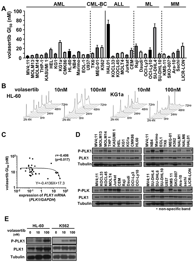 Figure 1: The efficacy of volasertib in a series of human hematological malignant cell lines. (A) The GI50 values of volasertib in acute myeloid leukemia (AML), chronic myeloid leukemia in blast crisis (CML-BC), acute lymphoblastic leukemia (ALL), malignant lymphoma (ML) and multiple myeloma (MM) cell lines. Error bars represent the mean ± S.D. of at least three independent experiments. (B) Cell cycle analysis in AML cell lines after volasertib treatment. (C) The correlation between the GI50 values of volasertib and the expression levels of PLK1 mRNA in each cell line. The correlation coefficient was determined by the Spearman’s rank correlation coefficient. (D) The protein levels of PLK1 and phosphorylated PLK1 were determined by western blot analysis in cell line. (E) The protein expression of PLK1 and its phosphorylation levels at 24 hours after volasertib treatment in HL-60 and K562 cells.