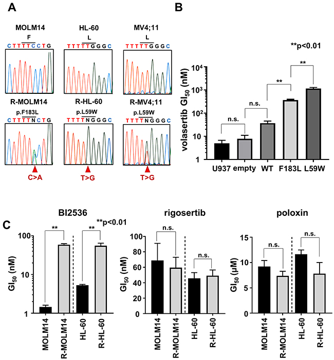Figure 3: The mutations in PLK1 ATP-binding domain conferred resistance to volasertib. (A) Genomic DNA sequence analyses of PLK1 in both the parental and the volasertib-resistant cells. (B) The GI50 values of volasertib on mutant PLK1 transduced U937 cells. One-way ANOVA was performed. (C) The GI50 values of BI2536, rigosertib, and poloxin were determined in both parental and volasertib-resistant R-MOLM14 and R-HL-60. Error bars represent the mean values ± S.D. of at least three independent experiments.