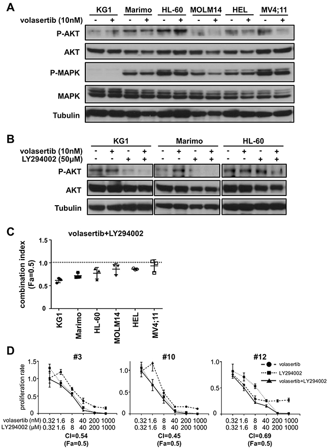 Since the up-regulation of cell survival signals are closely correlated with drug-resistance, we hypothesized that the signaling pathways involved in cell survival were activated upon volasertib administration. We examined phosphorylation levels of AKT and MAPK after volasertib administration in leukemia cell lines. The phosphorylation levels of AKT in KG1 and HL-60 cells were increased after treatment with volasertib, whereas those in MOLM14, HEL, and MV4;11 cells were decreased (Figure 7A). We next examined the phosphorylation levels of AKT after volasertib and/or LY294002, a potent inhibitor of PI3-kinase/Akt signaling, administration in the cell lines that showed up-regulation of pAKT. The phosphorylation level of AKT was decreased by LY294002 alone and combination with volasertib (Figure 7B). Finally, we studied the combination effects of volasertib with LY294002 in these AML cell lines. The CI indicated that the addition of LY294002 to volasertib provided synergic or additive effects in KG1, Marimo and HL-60 cells (Figure 7C and Supplementary Figure 7). On the other hand, this combination therapy did not exhibit combination effects in cell lines without up-regulation of pAKT upon volasertib administration. We also demonstrated that this combination provides synergistic effects in primary AML cells (Figure 7D). These results indicate that combination therapy with volasertib and PI3K inhibitor is a potent combination therapy against AML, and the pAKT level is a predictive marker for this combination.