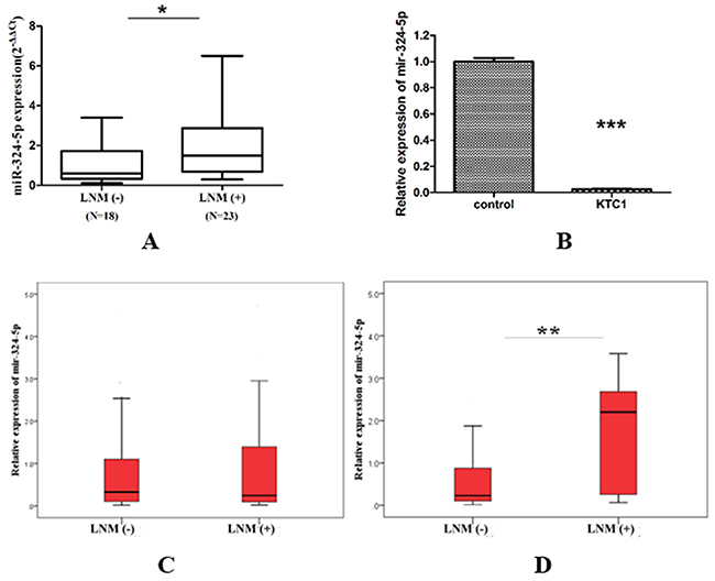 In recent years, studies of microRNAs (miRNAs) as potential biomarkers for diagnosis, prognosis, or therapeutic targets of cancer have drawn great attention [19, 20]. As one of the gene expression regulators, miRNAs are found to negatively modulate gene expression by targeting the 3’ untranslated region of mRNAs in a sequence-specific manner, and are involved in diverse biological processes [21-23]. Among them, miR-324-5p has been proven to be involved in the growth, invasion, and migration of different kinds of cancer [24-28]. However, its role in LNM of PTC remains unknown. Fine needle aspiration (FNA) is a high cost-effective method in PTC assessment [29-31]. It has been reported that detection of miRNA or BRAF mutation in FNA washout is helpful in estimating the character or invasiveness of thyroid nodules [32, 33]. Hence, the study aimed to investigate the role of miR-324-5p in PTC and the value of FNA-miR-324-5p together with ultrasonography in predicting LNM of PTC.