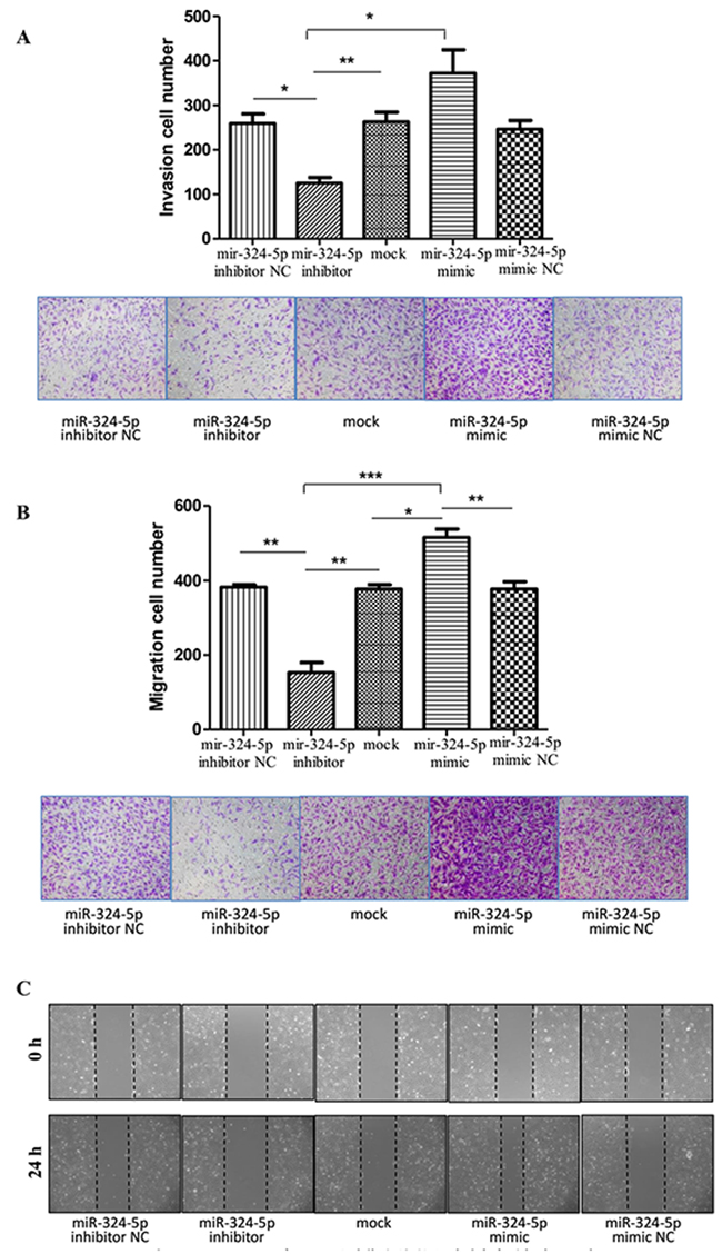 MiR-324-5p mimics or miR-324-5p inhibitors and their control oligonucleotides were synthesized by Shanghai Genepharma Co., Ltd. The sequences are listed in Table 7. A day before transfection, cells were plated at a density of 1.5×105 cells/well into 6-well plates. After culturing for 24h when the cell confluence was about 70%, transfection was conducted with Lipofectamine 2000 (Invitrogen, USA) following the manufacturer’s protocol. Transfection effect of miR-324-5p mimic and inhibitor in KTC1 cell line was illuminated in Supplementary Figure 1. Functional assays were conducted 24h-96h after transfection. Transfection efficiencies were evaluated by qRT-PCR.