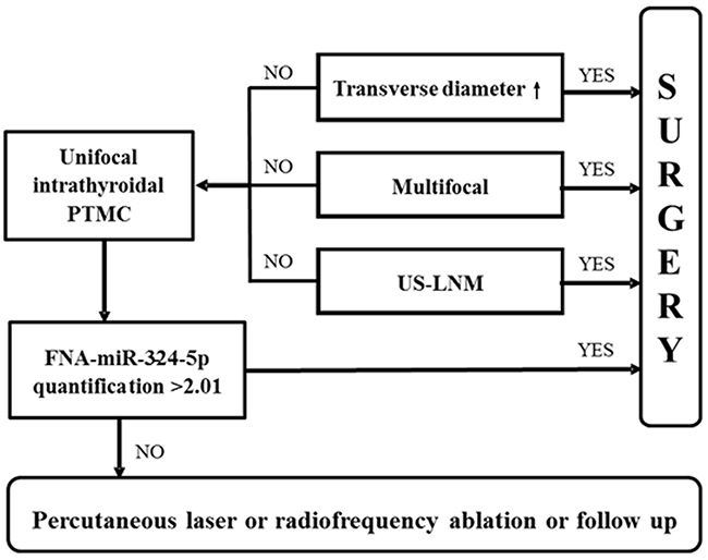ECS was a risk factor of LNM. Multifocality and advanced stage were independent risk factors of LNM. These demonstrate that PTC with LNM is more aggressive. Even in unifocal PTMC without ECS, there were still four advanced stage patients. Therefore, LNM assessment is still necessary for them. Ultrasound-guided percutaneous laser or radiofrequency ablation has come up to the clinical arena in low risk PTC treatment [41, 42]. LNM prediction guarantees the indication of such minimally invasive strategy. According to our finding, we propose that PTC patients with larger multifocal nodules or US-LNM should consider surgery. Unifocal intrathyroidal PTMC should test miR-324–5p expression in FNA washout for LNM assessment. If the expression level is higher than 2.01, surgery is recommended. Otherwise, percutaneous laser or radiofrequency ablation or following up could be considered (Figure 5).
