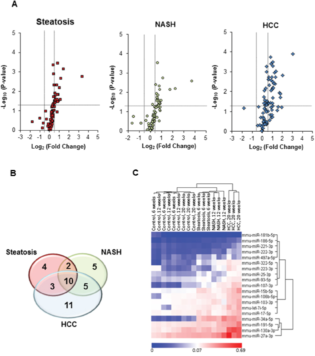 Figure 1: miRNA expression profiles in the livers of STAM mice subjected to NASH-associated hepatocarcinogenesis. (A) miRNA expression profiles in the livers of STAM mice at steatosis (6 weeks), NASH-fibrosis (12 weeks), and full-fledged HCC (20 weeks) stages of NASH-related liver carcinogenesis relative to control mice (n = 4 in control and experimental groups). The base 2-logarithm of the fold change is plotted on the X-axis, and the negative of the base 10-logarithm of the P-value is plotted on the Y-axis. Vertical black-dotted lines indicate the cut-off values for a 1.5-fold change. Horizontal black-dotted line indicates a P-value of 0.1. (B) Venn diagram illustrating number of differentially expressed miRNAs at 6, 12, and 20 weeks in the livers of STAM mice subjected to NASH-derived hepatocarcinogenesis. (C) Heat maps and unsupervised hierarchical cluster analysis of the 2−ΔΔCt values illustrating differences in the expression of ≥ 2-fold hepatic miRNA profiles between control mice and STAM mice at steatosis (6 weeks), NASH-fibrosis (12 weeks), and full-fledged HCC (20 weeks) stages of NASH-related liver carcinogenesis. Color bar identifies high-expressed (red) and low-expressed (blue) miRNAs.