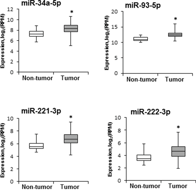 Figure 3: Levels of miR-34a-5p, miR-93-5p, miR-221-3p, and miR-222-3p in human HCC samples. miRNA expression and clinical data were downloaded from the TCGA database (http://cancergenome.nih.gov). miRNA sequencing data are presented as a base 2-logarithm of reads per million of each miRNAs in HCC tissue samples (n = 358) relative to that in non-tumor liver samples (n = 50). The statistical analyses of miR-34a-5p, miR-93-5p, miR-221-3p, and miR-222-3p expression datasets in human HCC samples were conducted by the Mann-Whitney Rank Sum test. * - denotes a significant (P < 0.05) difference from the non-tumor liver samples.