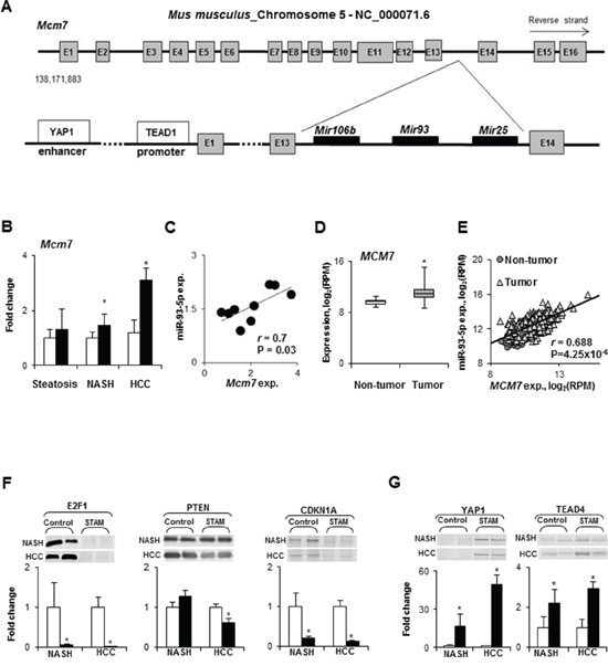 Figure 4: Expression of the Mcm7 gene and miR-106b~25 cluster during NASH-associated hepatocarcinogenesis. (A) Diagram of the mouse Mcm7 gene and its intragenic miR-106b~25 cluster. (B) Mcm7 expression in the livers during NASH-associate liver carcinogenesis. White bars – control mice; black bars - STAM mice. Values are mean ± SD, n = 5. * - denotes a significant (P < 0.05) difference from the age-matched control group. (C) Correlation plot of Mcm7 and miR-93-5p expression during NASH-associate liver carcinogenesis. (D) The median expression of the MCM7 gene in human HCC as determined by the Mann-Whitney Rank Sum test. * - denotes a significant (P < 0.05) difference from the non-tumor liver samples. (E) Correlation plot of MCM7 and miR-93-5p expression in human HCC. (F) Level of E2F1, PTEN, and CDKN1A directly targeted by miR-106b, miR-93-5p, and miR-25 in the livers of control mice and STAM mice at NASH-fibrosis and full-fledged HCC stages of hepatocarcinogenesis. White bars – control mice; black bars - STAM mice. Values are mean ± SD, n = 5. * - denotes a significant (P < 0.05) difference from the age-matched control group. Representative Western blot images of 2 different samples from the each group are shown. (G) Protein level of transcriptional effectors, YAP1 and TEAD4, of the Mcm7 gene in the livers of control mice and STAM mice at NASH-fibrosis and full-fledged HCC stages of hepatocarcinogenesis. White bars – control mice; black bars - STAM mice. Values are mean ± SD, n = 5. * - denotes a significant (P < 0.05) difference from the age-matched control group. Representative Western blot images of 2 different samples from the each group are shown.