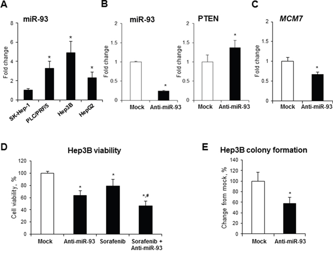 Figure 5: Effect of anti-miR-93 transfection on human Hep3B hepatocellular carcinoma cells. (A) Expression of miR-93 in human liver cancer cell lines. The expression of miR-93 in α-fetoprotein-positive PLC/PRF/5, Hep3B, and HepG2 cells is presented as an average fold relative to that in α-fetoprotein-negative SK-Hep-1 cells, which were assigned a value 1. * - denotes a significant (P < 0.05) difference from SK-Hep-1 cells. (B) Transfection of Hep3B cells with anti-miR-93 decreased the level of miR-93 and increased the level of the experimentally confirmed miR-93 target, PTEN. (C) Expression of the MCM7 gene in Hep3B cells transfected with anti-miR-93 and scrambled RNA oligonucleotide. (D) Effect of anti-miR-93 transfection on the viability of Hep3B and the sensitivity to Sorafenib. (E) Effect of anti-miR-93 transfection on the soft agar colony formation. * - denotes a significant (P < 0.05) difference from Hep3B cells transfected with scrambled RNA oligonucleotide. # - denotes a significant (P < 0.05) difference from Hep3B cells transfected with anti-miR-93 and treated with Sorafenib alone (n = 3). These results were reproduced in two independent experiments.