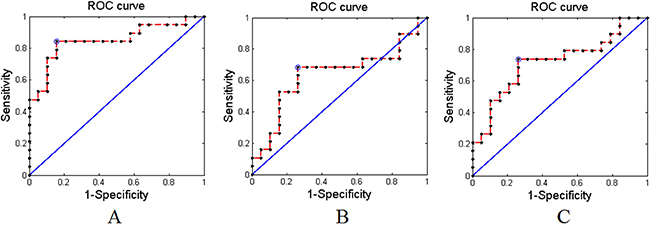 Figure 1: The receiver operating characteristics (ROC) curves of the proposed method with AAL-1024 atlas. (A) Between cMDD patients and HC; (B) Between rMDD patients and HC; (C) Between rMDD patients and cMDD patients.