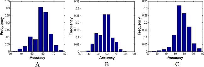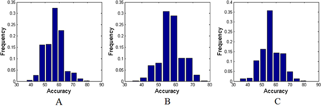 Figure 4: The permutation distributions of accuracies with AAL-90 atlas. (A) Between cMDD patients and HC; (B) Between rMDD patients and HC; (C) Between rMDD patients and cMDD patients.