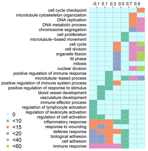 Figure 3: Functional enrichment of SCNA lncRNAs. The columns represent the score Intervals of lncRNAs. The rows represent the significant biological processes that enriched by lncRNAs. The different colors represent the degree of the enrichment significance (-log 10 (FDR)).