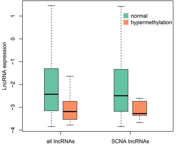 In order to evaluate the impact of methylation on SCNA lncRNAs, we identified differentially methylated lncRNAs in promoter regions by t-test method [32] (Supplementary Data S3; 66 hypermethylation and 2 hypomethylation lncRNAs, respectively). 22 of 66 hypermethylation lncRNAs were expressed in LUAD. Furthermore, the expression of 22 lncRNAs was lower than that of the others in LUAD (Wilcoxon test, p = 0.0022). 17 hypermethylation lncRNAs occurred SCNA at the same time and had low expression (Wilcoxon test, p = 0.015, Figure 4). To explore the relationship between low expression and hypermethylation, we calculated PCC for each lncRNA. In total, 12 of them were negatively correlated (p < 0.05, Supplementary Data S4). These results implied that the expression of the 12 lncRNAs was affected by both of the copy number and methylation level in promoter regions.