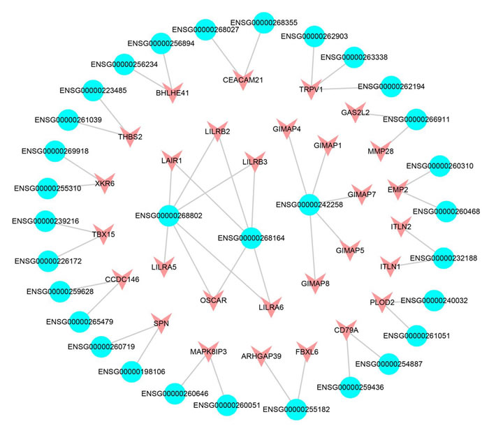 Figure 5: The cis-acting subnet of SCNA lncRNAs. The blue represents the lncRNAs, the red represents the differentially expressed PCGs.
