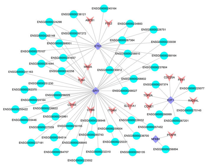 Figure 6: The lncRNA-TF-PCG network. The blue represents the lncRNAs, the red represents differentially expressed PCGs and the purple represents the TFs.