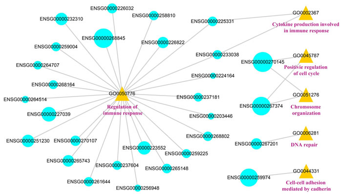 Figure 7: The visualization of the lncRNA-function network. The blue represents the lncRNAs, the yellow represents the GO number and the pink represents the GO terms. The size of the blue circles represents the DSS of the lncRNAs.