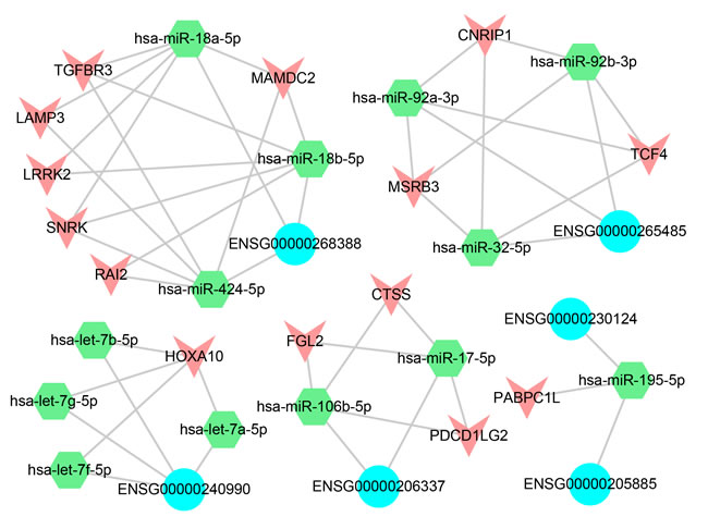Figure 8: ceRNA network. The blue represents the lncRNAs, the green represents the miRNAs and the red represents the differentially expressed PCGs.