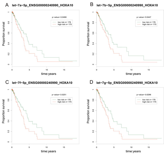We calculated the risk score [59] for each lncRNA-miRNA-PCG triple based on the risk score of single factor regression analysis of each node, and divided patient samples into high-risk and low-risk groups by median. The result showed that the ENSG00000240990-HOXA10 pair interacted with 4 miRNAs (hsa-let-7a/b/f/g-5p) and was significantly associated with prognosis (p < 0.05, Figure 9). The high-risk group had poor prognosis. Furthermore, the risk parameters of the 4 miRNAs were negative, while the risk parameters of the lncRNA ENSG00000240990 (HOXA11-AS) and PCG HOXA10 were positive. It was suggested that the patient survival can be affected by the ceRNA pairs. HOXA11-AS was a highly conserved lncRNA that located in the chromosome 7p15.2 [60]. Pervious study indicated that HOXA11-AS could serve as a biomarker for lung cancer metastasis and poor prognosis [61]. In our study, lncRNA HOXA11-AS and PCG HOXA10 were highly expressed (fold-change = 1.641 and 4.683, respectively). A study demonstrated that PCG HOXA10 overexpressed in lung cancer frequently [62] and was involved in the pathogenesis of lung cancer [63]. For lncRNA HOXA11-AS, it overexpressed in LUAD and was involved in the processes of NSCLC through regulating its target genes [64].
