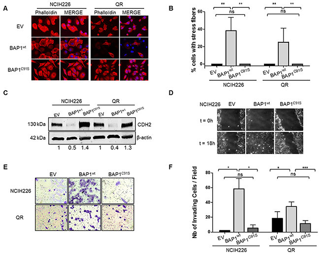 Figure 2: BAP1 deubiquitinase activity is associated with morphological changes and acquired invasive/migratory capacities. (A) Staining with DICT-phalloïdin (red) to observe F-actin fibers. Nuclei were counterstained with DAPI. Magnification x400. (B) Box plot representing the percentage of cells with F-actin fibers. (C) Western blot quantifying CDH2. β-actin is used as loading control. (D) Representative photographs of wound-healing assays at 0 and 18h after creating a wound (magnification x100). (E) Representative photographs of invasion in Boyden chambers after 24h (magnification x200). (F) Bar graphs based on quantitative data from E. Data are mean ± SEM. *: P < 0.05, **: P < 0.01, ***: P < 0.001 versus Empty Vector (EV). Each experiment was repeated at least three times. EV, BAP1wt, BAP1C91S: NCI-H226 and QR transfected with empty, wild-type BAP1 and deubiquitinase dead BAP1 vectors, respectively.