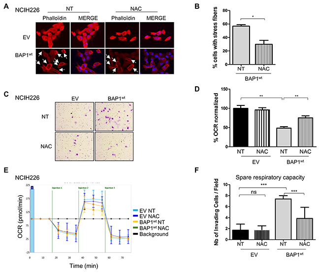 In a normal cellular context, increase of intracellular ROS level should result in mitosis, apoptosis and necrosis, but in a tumor context, this phenomenon has been shown to be involved in acquired tumorigenic properties such as invasiveness [25] and mitochondrial respiration defects [26]. To evaluate the effect of BAP1-related ROS increase in NCI-H226 mesothelioma model, isogenic cell lines were treated with low quantity of the anti-oxidant molecule N-acetylcysteine (NAC) for 10 to 15 days. The antioxidant effect of NAC was monitored by CAT expression, and showed a 1.5-fold decrease in NAC-treated BAP1wt cell line (Supplementary Figure 7). Cell morphology was then assessed by phalloïdin labelling and microscopy. Cell line expressing BAP1wt had a 2-fold decrease of number of cells presenting with cortical actin and stress fibers, as indicated by the cells marked with an arrow, before and after NAC treatment (7/13 vs 6/24). The graph illustrates a compilation of 7 images for each condition, (p<0.05, Figure 5A&5B) and no effect was observed in EV cells. NAC treatment also revealed a 2-fold decrease of invasive capacities of cell expressing BAP1wt (p<0.01), while confirming the difference between the two isogenic non-treated cell lines (4-fold; p<0.01, Figure 5C&5D). To evaluate the effect of increased ROS level on mitochondrial functions, OCR was measured after NAC treatment and revealed a significant 1.5-fold increase of respiratory capacities in BAP1wt cells (p<0.01), while no change was observed for EV cells (1.6-fold; p<0.001, Figure 5E&5F). Of note, this experiment confirmed the aforementioned difference between EV and BAP1wt non-treated cell lines.