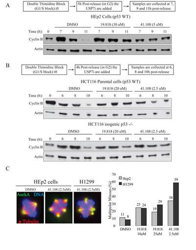 Fig. 3: Inhibition of USP7 stabilizes cyclin B and induces multipolarity. (A) HEp2 (p53+) cells were synchronized by DTB (S-phase block, 0h); USP7 inhibitors (USP7i), HBX 19.818 [61] and 41.108 [62] or DMSO (vehicle) were added 5 hours after DTB release (scheme on top); samples were collected at 7, 9 and 11 hours after DTB release. (B) HCT116 parental (p53+) and isogenic p53-/- cells were synchronized by DTB (S-phase block, 0h); USP7i were added 4 hours after DTB release (scheme on top); samples were collected at 6, 8 and 10 hours after DTB release. In all cell lines, USP7i protects cyclin B stability. (C) USP7i cause AurkA protein stabilization (not shown) which leads to accumulation of multipolar events in both cell lines. Left, IF for AurkA (green), α-tubulin (red), DNA (blue); right, quantification of multipolar events; >200 mitoses per sample.