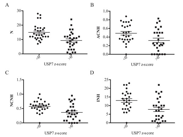 Fig. 6: Correlation analysis of USP7 transcripts levels and genomic instability in NCI-60 cell line panel. The transcript z-score on the x-axis was graphed against parameters of genomic instability on the y-axis; scatter plots ± SEM. In each case the genomic instability data is split into those with cell lines with USP7 transcript values less than or greater than 0, that is cell lines above or below the 60 cell line mean. (A) USP7 expression versus numerical complexity (N); p-value=0.0003. (B) USP7 expression versus the fraction of abnormal chromosomes that that experience numerical heterogeneity (ACHN); p-value=0.0084. (C) USP7 expression versus the fraction of normal chromosomes that that experience numerical heterogeneity (NCNH); p-value=0.0016. (D) USP7 expression versus the index of numerical heterogeneity (INH); p-value=0.0015.