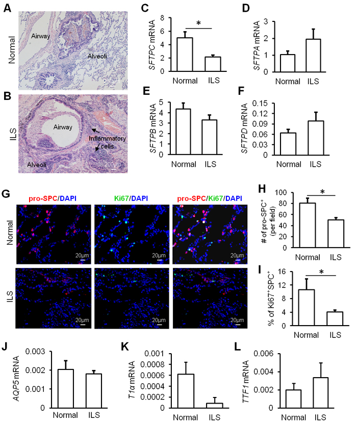 To gain insight into the pathological mechanisms underlying inflammation, we examined abnormal lung lobes that were surgically removed from ILS patients. Examination of paraffin sections of such lobes with H&E staining indicated a large number of inflammatory cells filling the alveolar space (Figure 1A and 1B). Structure of alveoli was severely distorted when compared to that from healthy controls (Figure 1A and 1B). The transcript level of surfactant protein C (SFTPC, a specific marker for AT2 cells) was significantly lower in the ILS lobe compared to normal lung (Figure 1C), but levels of SFTPA mRNA, SFTPB mRNA, and SFTPD mRNA were not different between the ILS lobe and normal lung (Figure 1D and 1F). Immunofluorescent staining also indicated that the expression of pro-SPC protein was decreased in AT2 cells (Figure 1G). Furthermore, the number of AT2 cells was reduced by over 40% in the ILS lobe (Figure 1H). Such loss was correlated with reduced proliferation of AT2 cells in the ILS lobe (Figure 1I). Messenger RNA expression of AQP5 gene, a marker for AT1 cells, remained unchanged (Figure 1J). Another AT1 cell marker T1 alpha (T1α) mRNA expression was decreased but not significantly in ILS (Figure 1K). TTF1 expression in ILS was similar to that in normal group (Figure 1L). These data suggested that repairing program of alveolar epithelium is altered in ILS.