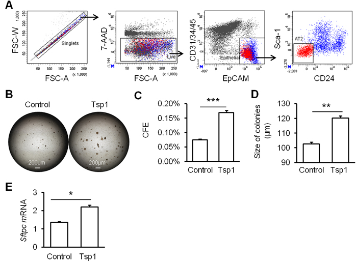 Figure 3: Tsp1 promotes mouse AT2 cell proliferation. A. FACS strategy of sorting mouse lung AT2 cells. B. Matrigel cultures of AT2 cells in the absence or presence of TSP1. C. Colony forming efficiency (CFE) of AT2 cells was summarized. D. The diameter of epithelial colonies (50μm or greater) was measured and analyzed. E. Sftpc mRNA expression was determined in matrigel cultures. Three independent experiments were conducted. *, P < 0.05, **, P < 0.01, ***, P < 0.001 by unpaired Student t-test.